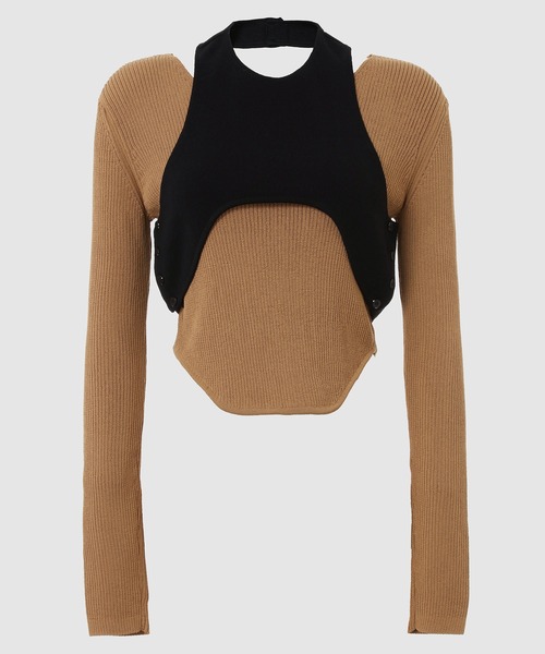 TAN (タン)Designer : Aki Murakami「触れる」 を意味するラテン語のタンジェールや、対極の無限の可能性を意味する 「タンジェント」 という言葉のように、TANはニットウェアの無限の可能性への憧れを込めて服を提案しています。「糸から服へ」 という言葉を実践の中心に据え、多種多様な編み方を駆使した複雑な風合いとデザインを生み出しています。一本の糸と一針がどのように変化するかを理解したTANは、ニットを通して無数の可能性を繊細かつ大胆に表現し続けています。・アールがついた変型ベストと、長袖のVネックプルオーバーがセットされたトップスはそれぞれ汎用性の高いアイテム・プルオーバーは前後どちらでの着用も可能な設計になり、顔まわりの印象を変化する一枚<information>・商品のお気に入り登録お気に入りアイテムの再入荷・在庫1点や、マークダウンなど、特別な情報を受け取ることができます。・ブランドのお気に入り登録新入荷(新着)や再入荷(再販)、メルマガなどの各種最新情報を受け取ることができます。