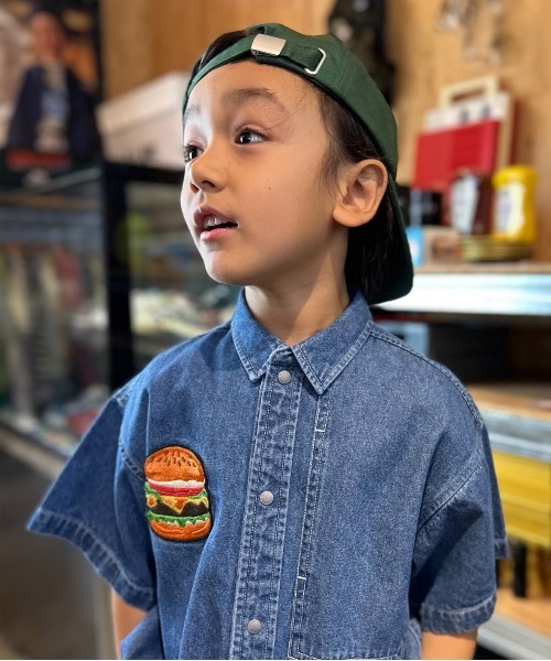 8ozデニムを使用した肩落ちするワイドシルエット半袖シャツ。右胸にはGROOVY COLORSのイメージモチーフの一つであるハンバーガーの豪華な刺繍ワッペン付き。着脱も簡単なドット釦仕様。