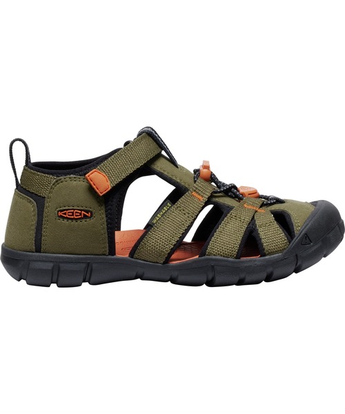 《KEEN.CNX》テクノロジー採用、軽量で携帯にも便利なハイブリッド・シューズ。 普段履きはもちろんの事、トラベル時のセカンドシューズやアクティブなスポーツに適したタイプ。 素材 ●UPPER : アッパーには速乾性に優れ、水や汚れに強いポリエステル素材を使用、ウォッシャブルで手入れも容易 ●FOOTBED : 足裏の形状に合わせて立体成型されたEVAフットベッドが快適なクッション性を発揮 ●MIDSOLE : クッション性に優れ、リサイクルも可能なTPRミッドソール ●OUTSOLE : プラスチックとゴムの中間の性質を持ちリサイクルも可能、軽量性と耐久性に優れたKEEN.FUSION RUBBERアウトソール、踏み跡を残さず、耐摩耗性とグリップ性に優れたノンマーキング仕様 特徴 ●脱ぎ履きが容易でコンフォートなフィット感、KEENならではのバンジーシューレースと、甲をホールドし脱ぎ履きを容易にする調節可能なHook & Loopストラップを採用 ●動いても動いても快適な速乾性ライニング ●土踏まずの形状に立体成型されたアーチサポートが、中足部へのサポート性を向上 サンダル / 男の子 / 女の子 / 子供 / 靴 / キッズシューズ / キャンプ /アウトドア / 水遊び / つま先保護 SEACAMP II CNX /キッズ サンダル / 1028851 / (Dark Olive/Gold Flame)