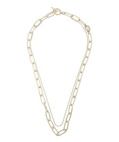 メタルパーツがポイントにあしらわれたツインチェーンネックレス。2種類の異なるチェーンを組み合わせることで、シンプルながらもユニークなデザインに仕上げました。付け外しもしやすいマンテル金具もポイント◎シンプルなTシャツやシアーなハイネックトップスと合わせるのもおすすめです。【その他採寸】F 全長:42-44cm