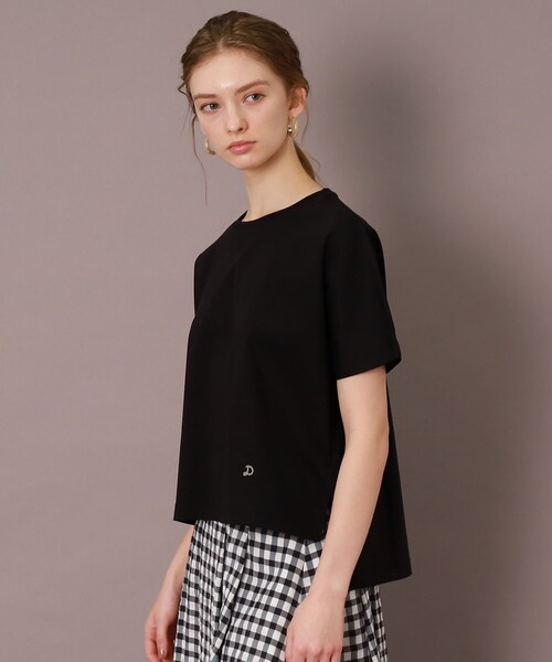 【さっと着るだけで今年らしいバランスに!アップデートしたドルマンスリーブTシャツ】昨年も大人気だったドルマンスリーブのTシャツが、裾の前後差と脇スリット入りになってアップデートしました。身頃と続きになったドルマンスリーブの程よいゆとりがリラクシーで大人っぽいTシャツ。前丈を短くすることで、前裾をタックインしなくても、コンパクトな上半身&脚を長く見せるスタイリングを作る事ができます。また、サイドスリットで抜け感が出るとともに横から見た時の着姿もおしゃれなバランスに!ドレステリアのオリジナル刺繍もポイントになり、一枚で着映えるTシャツです。ワールド開発素材、アイスクリアコットンを使用しており、シルケット加工を施した糸をスムース組織に編む事で、綿100%でありながら接触冷感機能があります。サトウキビを原料とする天然由来のポリマーを使用した加工により、不快な臭いそのものを無効化、吸収するので抗菌防臭・消臭効果も高い素材です。また、洗濯後も機能が保たれます。ワイドパンツやマキシスカートなどボリュームボトムと好相性。キレイなツヤ感のある素材なので、デニムやカーゴパンツなど、カジュアル素材のボトムもクラスアップさせてくれます。足元はヌーディーなフラットサンダルや、少しヒールのある華奢なサンダルを合わせるのがおすすめ!※同素材で、ワンピース(085-58026)、ベーシックTシャツ(085-18514)、ノースリーブTシャツ(085-18515)、ロゴTシャツ(085-18524)の展開もあります。※この製品は、抗菌防臭加工をしております。この効果は永久的ではありません。モデル情報:身長172cm B78 W59 H88 着用サイズ:38(M)店舗へのお問い合わせ商品番号:085-18513●製品寸法:34(SS):着丈前47cm 着丈後54cm B110cm 裄丈40cm36(S):着丈前49cm 着丈後56cm B114cm 裄丈41cm38(M):着丈前50cm 着丈後57cm B118cm 裄丈42cm備考: