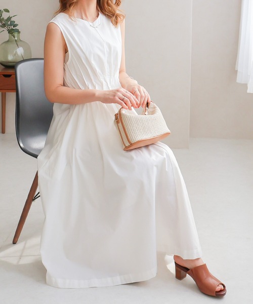 タックが織りなす魅力的なデザイン性! ■design・pointフロントタックがアクセントの効いたワンピース・デコルテ周りをスッキリと魅せてくれるVネック。・涼しげな印象のノースリーブデザイン。・後ろ開き仕様で後ろ姿も美しく。・女性らしいメリハリを生み出すフロントタック仕様。・タック位置をやや上に設定しスタイルアップ効果を発揮。・裾に向かって緩やかに広がる上品なフレアシルエット。・嬉しいサイドポケット付き。・サラサラとしたソフトな肌触りの生地感で快適な着心地。・可愛らしさときちんと感を兼ね備えたワンピースです。■fabric程よいハリ感のある綿100%素材ナチュラルな雰囲気のインド綿目の詰まった程よいハリ感のある上質素材。綿100%で吸湿・速乾性に優れています。通気性がよく、さらりと着られるので春夏の季節にぴったりの素材感。■coordinate・広がりすぎないシルエットな為、ボトムスを合わせる際はスッキリとまとめるのが鍵。・チュールアイテムやシアー素材のトップスと組んでトレンドmixするのもオススメです。・スニーカーでカジュアルに、サンダルでリゾートコーデ、パンプスやヒールでクラシカルに!合わせる小物で様々なスタイリングが可能に。※ご覧いただいている環境によっては、実際のカラーと異なって見える場合がございます。あらかじめご了承くださいませ。----------■■■もっとお得にお楽しみいただくために■■■【商品のお気に入り登録】再入荷通知や、ラストの通知、セール通知も受け取ることができます。【ブランドのお気に入り登録】新商品や再入荷など、お得な情報を受け取ることができます!※他のキャンペーンにより、期間中に価格が変動する場合があります。※セールは予告なく終了させていただく場合もあります。----------