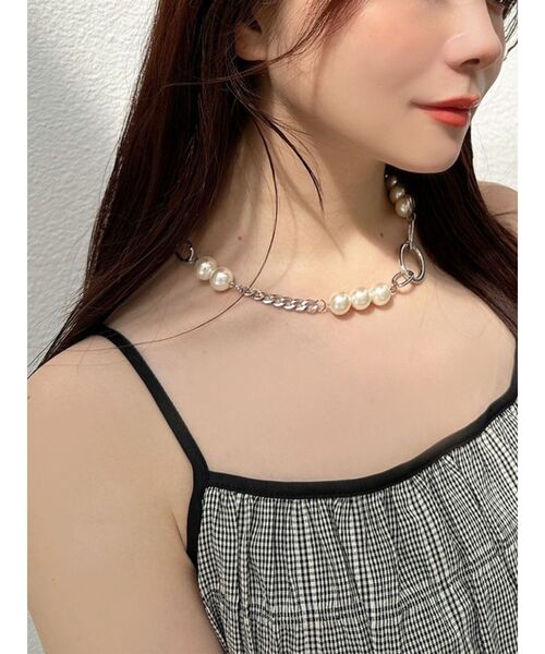 大きなパールが目を惹くパールチェーンコンビネックレス存在感があり、首元を華やかに飾ってくれます。デイリーはもちろん、様々なオケージョンで活躍してくれるデザインです◎