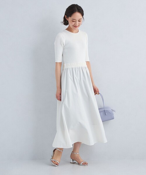 ドッキングデザインが目を惹くニットワンピース■デザイン上半身はリブ編みのニット素材、スカート部分はさらりとしたタフタ素材をドッキングした一着。メリハリのあるシルエットが上品な印象で着用いただけます。ウエストの切り替え位置はゴム仕様にし、すっきりと見えるようこだわりました。クリーンな雰囲気のホワイトカラーをご用意♪さらっと一枚で着映えするおすすめのワンピースです!■素材上半身は程よく身体にフィットするリブ編みのニット素材、スカート部分はややハリのあるタフタ素材でお作りしました。■コーディネート合わせる小物次第で雰囲気の変わる一着。華奢なストラップのサンダルと合わせた抜け感のある着こなしがおすすめです。・同デザインでブラック・ミディアムブラウンカラーのご用意もございます。対象品番:35261052649・同シリーズのプルオーバーのご用意もございます。対象品番:35181050376#春服,#夏服============================裏地:スカート部分 ややあり透け感:ありケア方法:手洗い可・ドライクリーニング============================【注意事項】※画像の商品はサンプルです。※商品を使用前に、タグ等に記載されている「取り扱い上の注意書き」、「洗濯表示」を必ずご確認ください。※商品画像は、光の当たり具合やパソコンなどの閲覧環境により、実際の色味と異なって見える場合がございます。あらかじめご了承ください。※商品の色味の目安は、商品単体の画像をご参照ください。店舗へお問い合わせの際は、全国のgreen label relaxing各店舗まで下記の品名/品番をお申し付けください。品名:CS HW タフタDKGニットOP WH_A 品番:35261052650
