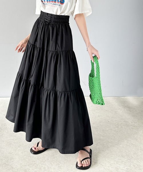 きれいめにもカジュアルにも着回せる。存在感たっぷりの主役級スカート。オシャレの幅が広がるティアードスカート。裾にかけてふわっと広がるシルエットが女性らしさを演出してくれます。ウエストのコルセットデザインがアクセントになり、スタイルアップ効果も抜群!トップスをインしても着映えるのがポイント♪細やかなウエストシャーリングで瞬時にお洒落見えします。■point・ウエストコルセットデザイン・ふんわりティアード・レースアップデザイン・スタイルアップ■detail歩くたびに綺麗に揺れるふんわりシルエットの美しいテイアードスカート。デザイン性もありながらポケット付きで機能性も持ち合わせた1枚。ウエストレースアップでぎゅっと細見え&ハイウエストでスタイルアップ効果抜群の仕上がりに◎女性らしい華奢な素材なので、たっぷりとボリューム感を持たせても軽やかな印象に仕上がっています◎■fabricハリ感のある布帛素材。……………………透け感:なし(アイボリーのみややあり)厚さ:普通伸縮性:なし裏地:なしポケット:あり洗濯方法:洗濯機可(ネット使用)…………………※ネットに入れてのお洗濯をお勧めいたします。※詳しいお手入れ方法は商品タグをご参照ください。■coordinateボリュームのあるシルエットなので、どんなトップスと合わせても華やか見えするのが嬉しいitem。Tシャツを合わせてカジュアルダウンした着こなしもおすすめ。ティアードスカートが華やかな分、他はラフなアイテムをチョイスすると上級コーデに◎きれいめ派も取り入れやすく、シャツやデニムジャケットなど、幅広いアイテムとの相性が良いので着回し力抜群!ハイウエスト仕様でスタイルアップ効果も期待できるのが嬉しい♪※ご覧のモニター環境により、画像の色味と多少異なる場合がございます。※サイズ表ウエストの()内はウエストゴム最大伸ばし寸となります。★《お気に入り登録》でお得な情報がいっぱい★・「商品のお気に入り登録」で再入荷通知や、ラストの通知、セール通知も受け取ることができます。・「ブランドのお気に入り登録」で新商品や再入荷など、お得な情報を受け取ることができます!