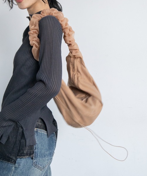‐2024 VACANCY BAG COLLECTION- とぅるんとした透明感のあるトレンド感UPのギャザーバッグ。 ◆FABRIC 全体的にソフトなシアー素材で包みこみ、エアリーで爽やかなショルダーバッグ。 ドロストを縛る事によりギャザーが集まり、クシュクシュ感がかわいいデザイン。 コンパクトなシルエットながら幅やマチがしっかりあるので、 見た目以上にしっかり収納が可能。 ドロストを絞って調整する事によって、ショルダーバックから ハンドバックまで様々なスタイルでお楽しみいただけます。 実用的なバッグとしてだけではなく、 ファッションの一部として取り入れるのもオススメです。 VACANCYの公式Instagram(@_vacancy_official)では、 収納容量や使い方のご紹介も行っておりますので、是非そちらもご覧ください。 ◆STYLE シンプルなコーディネートに合わせるだけでトレンド感アップするアイテム。 カジュアルはもちろん、モードやキレイめコーデにも相性が◎ GRAYは、優しいカラーで定番アイテムに馴染みやすく IVORYは、爽やかに実はコーディネートの差し色になります! BEIGEは、カジュアルに大人ヌーディな印象に。 ・・・・・・・・・・・・・・・・・・・・ 透け感:あり 裏地:あり 伸縮性:なし(ドロスト部分はあり) 光沢感:あり 生地の厚さ:普通 ・・・・・・・・・・・・・・・・・・・・ 【お買い物をお楽しみいただく為に】 ▼お気に入り登録をオススメ致します▼ ♡をクリックして下さい。 ・《商品のお気に入り登録》で再入荷通知や、ラスト1点の通知、セールの際の通知も受け取ることができます。 ・《ブランドのお気に入り登録》で新作商品や再入荷など、お得な情報を受け取ることができます!