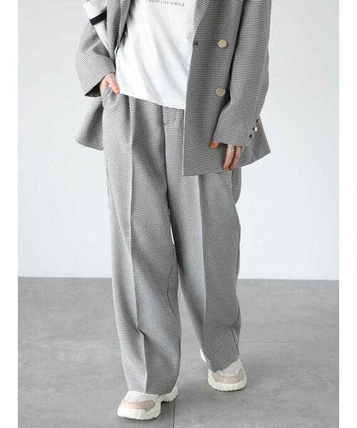 センタープレスを効かせたワイドシルエットのパンツ。 縦ラインを強調することで、レッグラインをすっきりと見せてくれます。 同シリーズのジャケットとセットアップでの着用も可能。 カジュアルな日常使いから、きちんと感のほしいオフィスコーデにと、幅広く活躍してくれるアイテムです。 ※商品画像は、撮影環境やお客様のご利用のPC・スマートフォンのモニター環境などにより実物と色味に差異がある場合がございます。 【その他採寸】 F ウエスト:[後ゴム仕様]66cm
