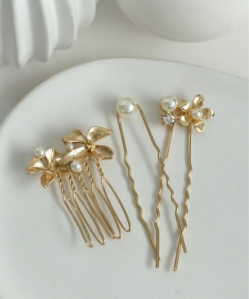 ■セレモニーヘアにプラス◎Uピンセット■ メタルフラワーやパールを組み合わせ、ヘアスタイルを華やかに飾るヘアコームとUピンのセットアイテム♪ 可憐な存在感のフラワーモチーフがヘアスタイルを上品な美しさでまとめ上げてくれます。 アップスタイルやダウンスタイルにプラスして様々なアレンジをお楽しみいただけます◎ 和装のスタイルでも合わせやすいアイテムです♪ 3点セットなので、ヘアアレンジに合わせてボリューム感を調整◎ パーティーシーンはもちろん、デイリーでも活躍できる使い回しアイテムです。 【結婚式/パーティー/入学式/卒業式/セレモニー/ハレの日/デイリー】 ▼商品画像について▼ ※撮影場所やお使いのモニター環境により実際の商品と若干お色味が異なる場合があります。 ======================= 《お気に入り登録》でお得な情報がたくさん! ▼商品のお気に入り登録▼ ♡をクリックしてお気に入り登録をすると 再入荷通知やラスト1点の通知をお知らせします。 ▼ブランドのお気に入り登録▼ お気に入りショップに追加していただくと いち早く ThreeFourTime のお得な情報・新入荷情報を 受け取ることができます。 =======================