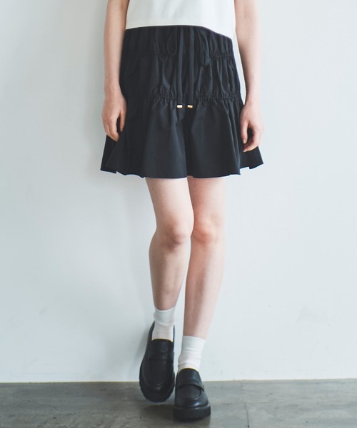 ◆◇◆2024 Spring/SummerCollection◇◆◇ メモリータフタ素材のウエストゴムのギャザーミニスカート。 ウエストはスポーティな配色のダブルウエストデザインでローライズ風に見えます。 シルエットが広がりすぎないようティアード切替にはゴムが入っており、裏地はパンツになっているため丈の短かさによる不安感を軽減してくれます。 ・‥…━…‥・‥…━…‥・‥…━…‥・‥…━…‥・‥… ▼サイズ 36/着丈48.5cm、ベルト巾6.5cm、ウエスト68.0cm、裾周り200.0cm、インナーパンツ股上丈31.0cm、インナーパンツ股下丈7.0cm、インナーパンツ裾周り63.5cm ▼ファブリック ----------------------------- 透け感: なし 伸縮性: ややあり 裏地:あり 光沢:なし 生地の厚さ:普通 洗濯:ドライクリーニング ----------------------------- ※サイズ表記につきましては、商品によって同サイズや同色等であっても各商品毎に誤差が生じる可能性がある為、サイズ表記はあくまでも目安としてご参照ください。 ※モデル着用アイテムはサンプル商品の為、実際よりサイズや色が異なる場合がございます。サイズはサイズ詳細等にてご確認下さい。 ※モデル着用カラーは、撮影環境の兼合いにて、実際のカラーと異なって見える場合がございます。商品カラーに関しましては、物画像をご参考ください。 ※取り扱いについては、商品についている品質表示でご確認ください。 ※商品画像はサンプルのため、色味や仕様変更がある場合がございますので予めご了承ください。 ※画像と柄の位置が異なる場合がございます、ご了承下さい。 ※撮影の照明状況やパソコンなどの環境により、若干製品と画像のカラーが異なる場合もございます。予めご了承ください。