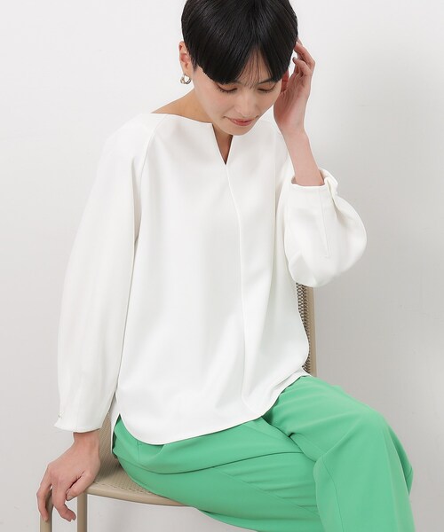 着心地◎のジャージ素材を使用しつつ、ブラウスのようなきれいめ見えが叶う 上品なキーネックデザインがポイントのプルオーバートップス 【デザイン】 ・キーネックデザインで顔まわりがすっきりと見え、上品な印象のトップス。 ・袖口にはパール調ボタンをあしらい、さりげないデザインポイントを加えています。 ・サイドにスリットを施し、ゆるやかな前後差をつけているので、インでもアウトでもきまるデザインです。 【素材】 ・ブラウスのようなきれいめな見た目が叶う、合繊素材のジャージを使用。 ・ナチュラルなストレッチ感で、着心地も快適です。 ・身体のラインを拾いにくい、程よい厚みのある素材。 ・マシンウォッシャブルでお手入れも簡単です。 ・UVケア機能つき ※この製品は、太陽光線中の紫外線(UV)を通しにくくします。この効果は永久的ではありません。 ※照明の関係により、実際よりも色味が違って見える場合があります。また、パソコン・スマートフォンなどの環境により、若干製品と画像のカラーが異なる場合もございます。 モデル情報:身長165cm B72 W57 H84 着用サイズ:38(M) 店舗へのお問い合わせ商品番号:637-18219 ●製品寸法: 36(S):着丈62cm B110cm 裄丈66cm 38(M):着丈63cm B111cm 裄丈67cm 40(L):着丈64cm B112cm 裄丈69cm 42(LL):着丈65cm B114cm 裄丈71cm 備考: