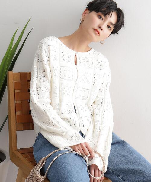 ヴィンテージな雰囲気漂うクロシェ編み風カーディガン。【デザイン】・モチーフ柄編みが素敵なクロシェ編み風カーディガンです。・短めの着丈で、ワンピースにも合わせやすいバランス感。・ボタンをとめてプルオーバーとしての着用もおすすめです。・裾スカラップもワンポイントデザインになっており、スタイリングのアクセントになる一枚です。【素材】・さらっとドライタッチな綿素材をクロシェ編み風のモチーフ柄編みにしたニットです。・ご家庭で手洗いが可能な素材。------------------【C(シー) OPAQUE.CLIP】「PLAYFUL FEMININE」をキーワードに、天然素材と美しくポジティブなカラー、ワクワクするようなディティールや、ミックス感のあるスタイルなどファッションの楽しさを詰め込んだ新レーベルです。※照明の関係により、実際よりも色味が違って見える場合があります。また、パソコン・スマートフォンなどの環境により、若干製品と画像のカラーが異なる場合もございます。モデル情報:身長165cm B72 W57 H84 着用サイズ:38(M)店舗へのお問い合わせ商品番号:637-38012●製品寸法:36(S):着丈46cm B102cm 袖丈51cm 肩幅42cm38(M):着丈47cm B106cm 袖丈52cm 肩幅44cm40(L):着丈49cm B111cm 袖丈54cm 肩幅46cm42(LL):着丈51cm B116cm 袖丈56cm 肩幅49cm備考: