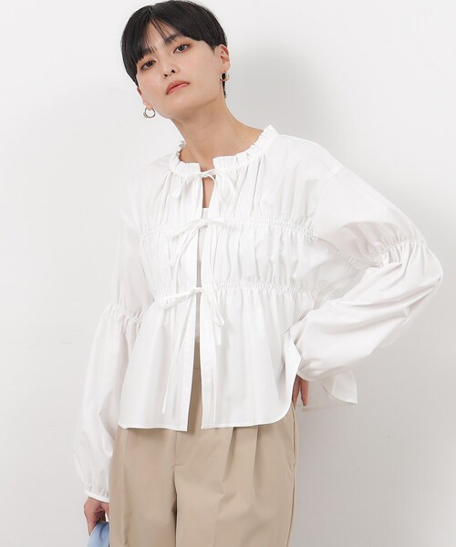 シャーリングリボンがトレンド感たっぷりのデザインブラウス。【デザイン】・フロントのリボンディテールが目を惹くフェミニンカジュアルなブラウスです。・前が開いているので、インナーとのレイヤードスタイルを楽しめ、カーディガン感覚でもお使いいただけます。・シャーリング部分はゴムになっており、着心地も快適。・クロップド丈なので、スタイルアップできる丈バランスも嬉しいポイントです。・袖をプッシュアップして着ると、また違った表情のボリューム感が可愛いです。【素材】・程よくハリがあるポリエステル/コットン(綿)のシャツ素材を使用。・マシンウォッシャブでご自宅でのお洗濯も可能------------------【C(シー) OPAQUE.CLIP】「PLAYFUL FEMININE」をキーワードに、天然素材と美しくポジティブなカラー、ワクワクするようなディティールや、ミックス感のあるスタイルなどファッションの楽しさを詰め込んだ新レーベルです。※照明の関係により、実際よりも色味が違って見える場合があります。また、パソコン・スマートフォンなどの環境により、若干製品と画像のカラーが異なる場合もございます。モデル情報:身長165cm B72 W57 H84 着用サイズ:38(M)店舗へのお問い合わせ商品番号:637-88034●製品寸法:36(S):着丈50cm B98cm 袖丈50cm 肩幅46cm38(M):着丈52cm B100cm 袖丈53cm 肩幅47cm備考: