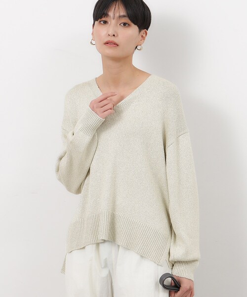 トレンド感たっぷりのラメヤーンを使ったベーシックなVネックニットプルオーバー【デザイン】・1枚で着回しの効くベーシックなデザインのVネックニットプルオーバー・トレンド感のあるラメヤーンを使用する事で、華やかな印象に。・ややゆとりのあるボディと、後ろ着丈を長くする事で、ヒップ周りもカバーして着て頂けます。・脇にはスリットを入れ、前後差を付けた着丈にデザインし、抜け感のある着こなしが可能です。・パンツスタイルにはもちろんですが、ボリューム感のあるスカートやナロースカートなど、幅広いスタイリングにおすすめです。【素材】・意匠感のあるラメヤーンを使用した、レーヨン混のニット素材・ご自宅での手洗いが可能※照明の関係により、実際よりも色味が違って見える場合があります。また、パソコン・スマートフォンなどの環境により、若干製品と画像のカラーが異なる場合もございます。モデル情報:身長165cm B72 W57 H84 着用サイズ:38(M)店舗へのお問い合わせ商品番号:637-18058●製品寸法:38(M):着丈62cm B106cm 袖丈50cm 肩幅49cm40(L):着丈63cm B109cm 袖丈50cm 肩幅51cm42(LL):着丈65cm B112cm 袖丈51cm 肩幅54cm備考: