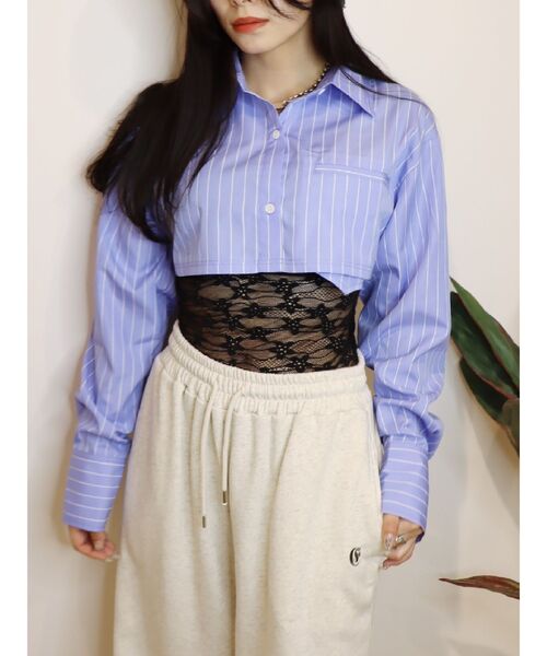 【春シャツ】【ストライプシャツ】【ショート丈】【春服】■デザインコンパクトな丈感がトレンド感たっぷりなシャツ。ベーシックなアイテムながら、ポケットがちらりと見えるデザインでひとくせ◎短丈ですが胸まわりはゆとりのある作りでツッパリ感なく着ていただけます。■スタイリングインナーを合わせたスタイルや、ビスチェなどとのレイヤードスタイルがおすすめです。これからの時期はキャミワンピの羽織りなどにも。ミニスカートと合わせたスタイルもトレンド感があって◎-------------- 透け感:ややあり裏地:なし 生地の厚み:普通伸縮性:なし --------------短めの丈でトレンド感のあるシャツ。ポケットの袋布が裾から見えるデザインがポイントです。短めですがバストや裾巾は大きめに設定しているため、ゆるっと着用できます。