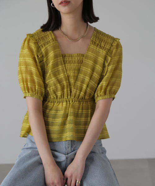 [fabric&Design]表面感のあるシアーボーダー素材のブラウス。肩と胸元部分に細かなシャーリングを施し、肩にはフリルデザインで立体感のあるシルエット。ペプラムデザインでウエスト部分はゴム仕様になっているので着心地も良いです。バック部分にはリボンディティールで後ろ姿もかわいいです。[Styling]ペプラムシルエットなのでパンツとの相性が◎デニムやハーフパンツにスポーツサンダルやスニーカー、CAPを合わせで甘すぎないスタイリッシュな着こなしがおすすめ。■透け感:ややあり■生地の厚さ:普通■裏地:なし■伸縮性:なし■光沢:ややあり■シルエット:スタンダードmodel:骨格ウェーブ---------------------------------------------------◆商品のお気に入り登録◆お気に入りアイテムの値下げ・再入荷・在庫1点などの通知を受け取ることができます。◆ブランドのお気に入り登録◆新商品や再入荷、セール、クーポン配布などお得な情報を受け取ることができます。---------------------------------------------------※ご注文いただいた予約商品のお届け時期の確認は、注文履歴ページより行えます。