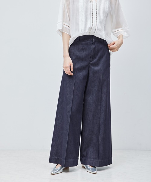 【素材】 反応染めで染められた限りなく本物デニムを表現した素材。さらにシルク混なので、特有のつや感があります。カジュアル感とエレガンス感を併せ持つ上質デニム素材です。色落ちを気にせずまたストレッチ性がある着用できるのもうれしいポイント。 【デザイン・シルエット】 裾幅がしっかりあるバギーシルエットのデニムパンツ。センタープレスが入っていますので、きれいめスタイルにもなじむパンツです。カジュアルすぎないデニムパンツは今シーズンスタイリングのマストアイテムです。 同素材のスカート(品番:GGC24320)もございます。 【カラー】 ネイビー1色展開。 【おすすめのスタイリング】 カジュアルにもきれいめにも着用できるデニム素材なので、カジュアルなジレと合わせても、きれいめなブラウスとあわせても決まるデザインです。 ---------------------------- 透け感:なし 裏地:なし 伸縮性:ややあり 光沢感:なし 生地の厚さ:薄手 ポケット:あり 開き方:ファスナー ---------------------------- 【モデル情報】 モデル身長:168cm 着用サイズ:38 ※画像の商品はサンプルです。実際の商品と仕様、加工、サイズが異なる場合がございます。 ※撮影場所やライティング、お使いのモニター環境によって色の見え方が異なる場合がございます。 ※商品のカラーは画像の色味をご参照ください。動画は仕様説明のため、色味が実物と異なる場合がございます。