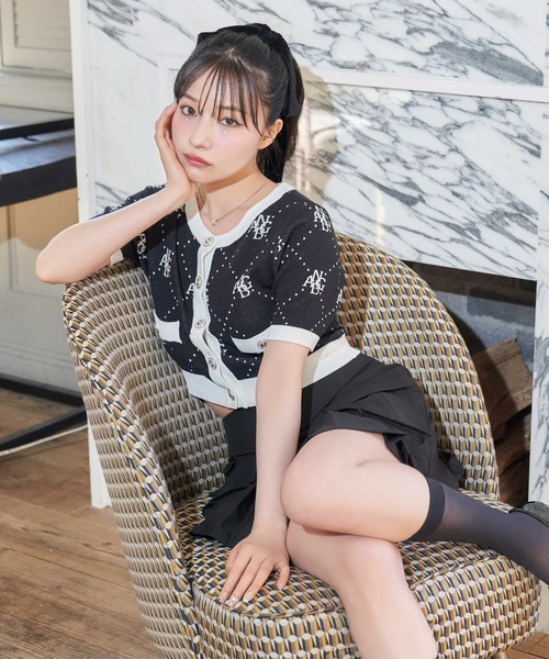 オリジナルのモノグラム柄をあしらったニットカーディガン。シャリシャリした涼しい素材感です。スカートやパンツとバランスの良い丈感です。