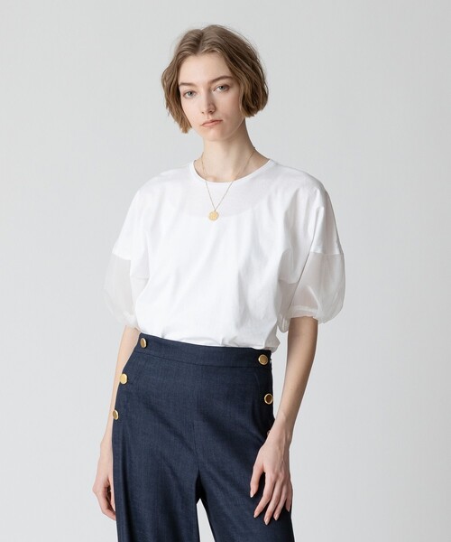 【allureville 2024 spring&summer】シアー素材とドッキングしたランタンスリーブカットソー。コロンと丸みのあるランタンスリーブは、肩下から透け感のある素材に切り替わるデザインです。気になる二の腕をしっかりカバーしつつ、軽やかな印象の一着です。ボディーはシルケットカットで綺麗な素材を使用。イージーケア可能なアイテムなので、これからのシーズン重宝すること間違いなし。【スタッフコメント】透け感のある袖が可愛いカットソー。近くで見ると二の腕から透け感のある素材になっており、気になる肩周りや二の腕をカバーしてくれます。身幅もコンパクトで綺麗かつボディラインが出過ぎない絶妙なシルエットです。コットンとポリエステル素材で扱いやすく、ご自宅でお手入れ可能です。幅広いシーズン活躍の一枚です。スカートなどフェミニンに合わせるスタイルも可愛く、甘さが気になる方はデニムやパンツ合わせがおすすめ。※手洗い可能です。◎<お気に入り登録>でお得な情報◎・「商品のお気に入り登録」で再入荷通知や、ラスト1点の通知、セール通知も受け取ることができます。・「ブランドのお気に入り登録」で新商品や再入荷など、お得な情報を受け取ることができます。※照明の関係により、実際よりも色味が違って見える場合がございます。またパソコン・スマートフォンなどの環境により、製品と画像のカラーが異なる場合もございます。予めご了承ください。