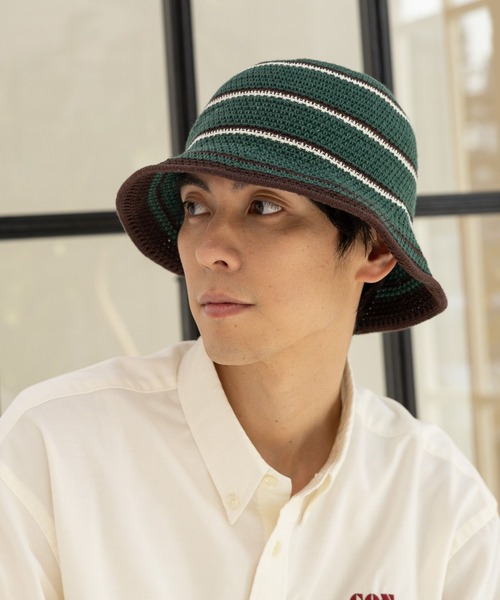 ボーダー柄がコーディネートのポイントになる、バケットハット。暑いシーズンにも活躍する、軽いニット素材です。カジュアルなスタイリングに合わせやすいアイテム。定番のカラーに加え、差し色になるグリーンもご用意しました。