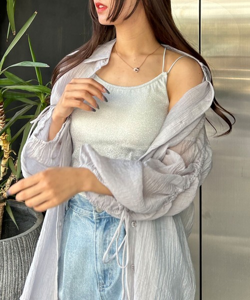 バッククロスストラップで後ろ姿も抜かりなしのキャミソール。キラキラ光るラメが目を惹く華やかな印象のキャミソール。華奢見えを叶えるダブルデザインの細めの丸ゴムがスタイリッシュな印象。女性らしさを際立たせてくれます。パット付で1枚でも安心感のあるデザインになっているのが嬉しいポイント◎ラメが動く度に光を放ち、コーディネイトのアクセントにもぴったりです。シャツやカーディガンに合わせて見せるインナーとして大活躍間違いなし◎シアー素材などの透け感アイテムからラメのちら見せがオススメ。シーズン長く活躍してくれます。ボトムはカジュアルから綺麗めまで幅広いジャンルと相性抜群です。・パッド取り外し可【以下グレー参考。カラーにより多少の誤差あり】・透け感:やや透ける・伸縮性:あり・生地の厚さ:普通・裏地:あり▼Recommend・ラメ・バッククロスキャミ・ラメキャミ・ガーリー・フェミニン・大人カジュアル・カジュアル・デートコーデ・春コーデ・お出かけ