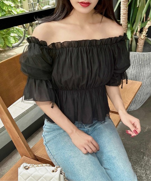 2024 SS 春夏アイテム フェミニン感満載♡ シフォンとチュールを重ねたオフショルデザインのブラウス。 華やかなボリューム感のあるブラウスは1枚で主役級トップス確定! 異素材を組み合わせることでシンプルなワンカラーも表情のある1枚に仕上げています。 袖のリボンがより女っぽさをアップさせてくれるデザインになっております。 ショート丈のトップスなので脚長効果が狙えるのもポイント◎ 透け感のある生地も裏地付きなので安心です。 甘めのブラウスなので、デニムやカーゴパンツなどで甘辛MIXコーデがおすすめ。 フェミニンに着こなしたいならショートボトムやスカートを合わせても◎ 春のデートにオススメの1枚です。 ▼Recommend ・オフショルブラウス ・チュール ・袖リボン ・ガーリー ・フェミニン ・大人カジュアル ・デートコーデ ・甘めコーデ ・春コーデ ・お出かけ