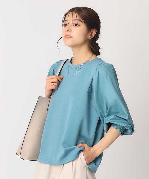 【デザイン】お袖異素材ドッキングの七分袖トップス。袖口にシャーリングゴムを使用することで、プッシュアップができ、抜け感を出して着ていただけます。家事などをこなしやすくしたいときには、さっとまくりやすいのも日常に嬉しいポイント。身頃はジャージ素材なので楽な着心地。お袖は布帛素材でブラウスのようなきちんとした印象を与えてくれるトップスです。【スタイリング】ボリュームのあるスカート合わせで、フェミニンなスタイリングがおすすめ。センタープレス入りのワイドパンツやテーパードパンツを合わせれば、かっこいい印象のオフィスコーデにもマッチ。パールのネックレスなど、アクセサリーをプラスするとより好印象に。【素材】身頃はジャージ素材。お袖はブラウス・シャツ素材※照明の関係により、実際よりも色味が違って見える場合があります。また、パソコン・スマートフォンなどの環境により、若干製品と画像のカラーが異なる場合もございます。モデル情報:身長164cm B78 W56 H80 着用サイズ:02(M)店舗へのお問い合わせ商品番号:741-18333●製品寸法:02(M):着丈59cm B102cm 袖丈50cm 肩幅32cm03(L):着丈61cm B108cm 袖丈51cm 肩幅33cm04(LL):着丈64cm B108cm 袖丈52cm 肩幅35cm備考: