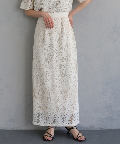 華やかさが目を惹くレーススカート【Point/Styling】リーフモチーフのレース×シアー素材がシーズンムードを高めます。上品な透け感とさりげない肌見せでフェミニンかつ大人な雰囲気を演出。タイトなIラインシルエットにハイウエストでスタイルアップ効果も◎生地に特徴があるため、シンプルなブラウスやTシャツと合わせるだけで洗練されたスタイリングが完成。同素材のブラウス(988-64210)とセットアップとして着用が可能で、オケージョンシーンにもおすすめです。----------------------------------------------------【Detail】シンプルなシルエットを引き立ててくれるやや立体感のある総レース素材を使用。ウエスト部分はリブ×後ろファスナーで着脱時のストレスを軽減しつつきちんと見えもばっちり。バックスリットを施しているため足捌きが良く、また、スリットから覗く脚を美しく魅せます。シックな着こなしが可能なブラックと大人かわいいエクリュの2色展開。透け感/あり光沢感/なし伸縮性/なし裏 地/あり厚 み/薄いウエスト部分ゴム仕様ポケットなし----------------------------------------------------※撮影場所により、実際の色味と若干異なる場合がございます。またパソコン・スマートフォンなどの環境により、若干製品と画像のカラーが異なる場合もございます。予めご了承ください。※商品画像はサンプルのため、色味やサイズ等の仕様に変更がある場合がございますので、予めご了承ください。----------------------------------------------------【お買い物を楽しんで頂く為に】■商品のお気に入り登録お気に入りの登録をして頂きますと完売カラーの再入荷通知や、ラスト1点の通知を受け取ることができます。■ブランドのお気に入り登録新商品の発売や再入荷、タイムセールやクーポン発行のお知らせなど&g'aimeがお届けするお得な情報を受け取ることができます。