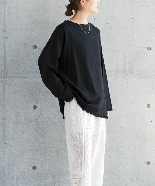 【大人ナチュラルに仕上がるリネンブラウス】 風合いのあるリネンボイル生地を使用したTブラウスは、裾と袖口のフリンジディティールがアクセントになる一着。 甘い織り目でざっくりとした雰囲気がありながら、ゆとりのあるリラクシーなシルエットが一枚でも様になるアイテム。 デコルテラインがきれいに見えるボートネックが女性らしい抜け感を演出し、長めの着丈が気になる腰周りをカバーできるのも嬉しいポイントです。 POINT ・リネンボイルのカジュアル素材 ・デコルテがきれいに見えるボートネック ・フリンジディティール COORDINATE きれいめのボトムスと合わせたスタイリングがおすすめです。 【2024 Spring/Summer】【24SS】 ※この商品は、麻を使用しております。素材の特性上、ネップや織りムラがある場合がございますが、素材の特徴としてお楽しみください。 ※この商品は、一部フリンジ部分があります。ほつれやすくなってますのでご注意ください。 ※その他お取り扱いに関しましては、商品に付属のアテンションタグをご覧ください。 ※商品画像は、光の当たり具合やパソコンなどの閲覧環境により、実際の色味と異なって見える場合がございます。予めご了承ください。 ※商品の色味の目安は、商品単体の画像をご参照ください。 ▼お気に入り登録のおすすめ▼ お気に入り登録商品は、マイページにて現在の価格情報や在庫状況の確認が可能です。 お買い物リストの管理に是非ご利用下さい。 素材感 透け感 : ややあり(OFF) 伸縮性 : ややあり 裏地 : なし 光沢 : なし ポケット : なし