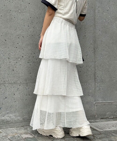 これからの季節ぴったりな涼しげメッシュティアードスカート▼ポイントメッシュ素材で甘すぎずカジュアルに着用できるティアードスカート。歩くたびふわっと揺れるシルエットが女性らしく柔らかな印象を与えてくれます。ウエストはゴム仕様でストレスフリーな着心地です。カラーはスタイリングがしやすいブラック、ホワイトと1枚でコーデの主役になるグリーンの3色展開です。▼スタイリングデザイン性のあるアイテムなのでシンプルなトップスと合わせてもお洒落に決まります。オーバーサイズのスウェットやパーカー、Tシャツを合わせたずるっとしたスタイリングも◎小物はキャップやスニーカーなどボーイッシュなアイテムが相性抜群です。---------------------------------------------------透け感:ややあり(ホワイト)伸縮性:あり(ウエストゴム)裏地:あり光沢:なし---------------------------------------------------家庭洗濯:40℃限度/洗濯機[弱い]タンブル乾燥:不可アイロン:低温110℃まで※スチームなしクリーニング:ドライクリーニング不可、非常に弱い処理によるウェットクリーニング可●洗濯ネットを使用してください。●浸け置き洗いは避け、洗濯後はすぐに脱水して、形を整えて陰干ししてください。●濃色製品は色移りすることがありますので、他の物と分けて洗濯してください。●アイロンの際はあて布を使用してください。●着用、着脱の際は、ベルト、バッグ、金具や突起物との引っ掛かりにご注意ください。●素材の特性上、洗濯により若干縮むことがあります。---------------------------------------------------※着用、お取り扱いの際は、商品についている品質表示とアテンションタグを必ずご確認下さい。※画像の商品はサンプルです。実際の商品と仕様、加工、サイズが若干異なる場合がございます。※可能な限り実物に近いカラーにて掲載していますが、撮影環境やモニター環境などにより製品と画像のカラーがやや異なって見える場合もございます。予めご了承ください。_________________________________________________________▼商品のお気に入り登録「カートに入れる」ボタン横に表示されている「♡」をクリック。・在庫残りわずかになったとき、完売商品の再入荷、セール情報などを受け取る事ができます。▼PALCLOSETアプリにてブランドフォロー・新商品や再入荷などいち早くお得な情報を受け取ることができます。・スタッフコーディネートやブログをお楽しみ頂けます。≪返品・交換について≫・着用後、洗濯後の返品・交換は致しかねます。・商品到着後、着用前に商品状態のご確認をお願い致します。