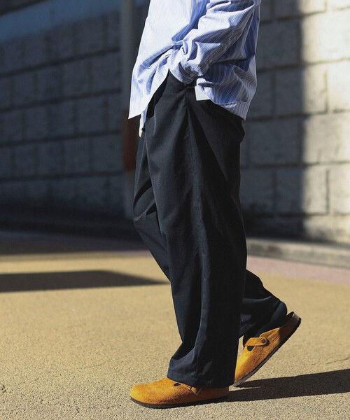 リラックスして穿ける高機能イージーパンツ ■デザイン ウエストに2タックが入ったややゆったりとしたワイドパンツ。ボリュームあるシルエットが特徴的で、裾を絞ることでデザインに変化をつけられます。ベルトレスで着用できるイージー仕様も春夏に嬉しいポイント。 ■コーディネート クリーンな表情のパンツなので、カジュアルなTシャツスタイルだけでなく、シャツとの爽やかな合わせもおすすめです。 ■素材 軽く吸水速乾(QUICK DRY)と接触冷感を併せ持った高機能素材を使用。滑らかなタッチでストレッチ性もあり、快適な着心地を実現します。 Model:H176 66kg Size:L ■ケア方法 水洗い・ドライクリーニング両方可 ※(詳細は商品についている品質表示ラベルをご覧ください。) ■アテンション 「吸水速乾」 吸収した水分を素早く乾燥させ快適性を保ちます。 この加工は永久的ではなく着用やクリーニングを繰り返すことにより効果は低下することがあります。 「接触冷感」 ひんやりと涼しい着心地を体感できます。着用やクリーニングを繰り返すことで効果が低下することがあります。 ※商品の色味は白背景の商品単体で撮影した画像をご参照ください。 ※光の当たり具合やパソコンなどの閲覧環境によって実際の色味と異なって見える場合がございます。予めご了承ください。