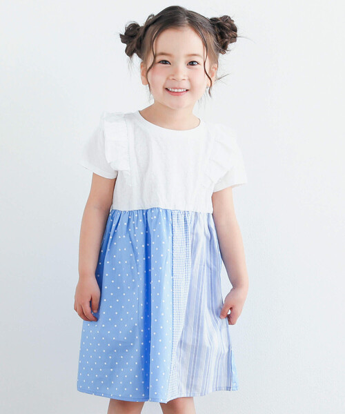 前から後ろにグルっと入った肩のフリルがキュートな半袖ワンピース。 上身頃もさりげなくドット柄なところがオシャレなポイント。 ドットにチェックにストライプ...3つの柄を切り替えたスカートがインパクトのあるアイテムに仕上げました。 後ろ側のスカートはドット柄のみだから、前後で雰囲気が変わる遊び心のあるデザインになっています。 ガバッと上からかぶって着られるからお着替えしやすくてママも何でも自分でやりたいキッズもニコニコ。 付属品がなくお手入れしやすいのはママがうれしいポイント。 春夏のデイリー使いからお出かけまで、たくさん活躍してくれる1着です。 パッと目を引くのに上品さもあるブラック系、夏の青空のようにさわやかなブルー系の2色展開です。 ※右脇ポケットあり。 ※柄の出方は生地の裁断により一点一点異なります。 2024年春夏女の子アイテム。 【 2024年 3月のテーマ / childish MIX 】 イベントごとが多い春は進学や進級など、子どもの成長を感じる日々... 子どもから1歩ずつ大人になるけど、子どもらしい純粋な心のまま、成長してほしい。 自分らしく自分が好きなものは好きでいられるように。 春風にそよぐ若葉のようなフレッシュなカラーを取り入れて展開します。 【 2024 SPRING / SUMMER MIX MOOD 】 注目される自然との共存、拡大するデジタル世界・・・ 相反するものが共存してともに大きく成長して交差する時代。 お洋服だって様々なテイストが多様にMIXされて共存してもいいんじゃない? これだけって選ぶ必要はないはず! 好きなものを好きなだけ。 少しのスパイスをMIXすることでイマっぽい自分だけの服を。 【SLAP SLIP(スラップ スリップ)】 ~子どもの欲しいをカタチに~ ヨーロッパのこどものように 子どもらしい今しか着れないナチュラルなかわいさを提案 どこか上品で清楚感漂うフレンチカジュアルは いつものコーディネートをさりげなく格上げ