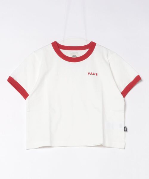 空紡糸を使用したドライタッチなリンガー半袖Tシャツ リブ・刺繍のカラーを統一したPOPなデザイン。 シルエットはコンパクトなクロップド丈。