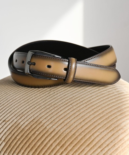 スムースレザーのグラデーションベルト。程よいツヤ感と美しいグラデーションで品の良さが感じられる仕上がりです。ビジネスシーンからキレイめカジュアルなスタイルまで幅広く活躍してくれます。□素材表面:牛革裏面:合成皮革□長さ調整フリー金具付の為バックルを取り外して、必要ない部分をカットすることで簡単に調整できます。※ブラックはグラデーションが目立ちにくくほぼ無地に近い仕上げになっています。