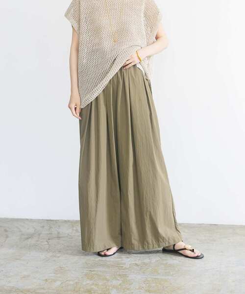 7月5日 新色(NAVY)を追加しました 【リラクシーな履き心地と機能性を兼ね備えたイージーパンツ】 撥水・イージーケア・接触冷感・UVカットの機能が備わった素材を使用したイージーパンツ。 腰周りにゆとりの出るタックとギャザーを施すことで、締め付けがなくリラクシーな穿き心地を実現。内側の紐で身長に合わせてサイズ調節も可能です。 薄手のナイロン素材でシワが気になりにくく、軽量でシンプルなデザインがデイリーに活躍します。 POINT ・機能性素材 ・ウエストゴムでストレスフリー ・撥水加工で雨の日も活躍 COORDINATE カジュアルにカットソー、女性らしくブラウスと、お手持ちのアイテムでバランス良くコーディネートいただけます。シアーシャツなどのトレンドアイテムとのスタイリングもおすすめ◎ 『UR TECH』 株式会社アーバンリサーチが独自開発して生まれた素材「UR TECH」シリーズ。 「接触冷感」「UVカット」「抗菌」「撥水」機能を併せ持った高機能な素材です。 【2024 Spring/Summer】【24SS】 ※この素材は、はっ水加工をしてあります。はっ水加工は永久的なものではなく、着用や洗濯を繰り返すと、効果が低下します。クリーニング店での再加工や市販のはっ水スプレーのご利用をおすすめいたします。 ※商品画像は、光の当たり具合やパソコンなどの閲覧環境により、実際の色味と異なって見える場合がございます。予めご了承ください。 ※商品の色味の目安は、商品単体の画像をご参照ください。 ▼お気に入り登録のおすすめ▼ お気に入り登録商品は、マイページにて現在の価格情報や在庫状況の確認が可能です。 お買い物リストの管理に是非ご利用下さい。 素材感 透け感 : なし 伸縮性 : なし 裏地 : なし 光沢 : なし ポケット : あり