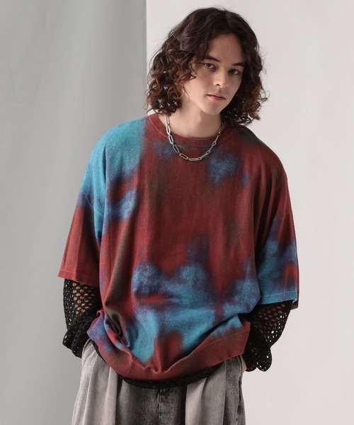 ーーー ニットに柄を入れ込んだデザインニットが登場。 ーーー point □編地で柄を作るニットにプリントを入れることで、グラデーションの綺麗なぼかした柄を表現。 □抽象的なグラフィックで1枚でモードな雰囲気に。 □シャリ感が強くドライタッチな糸を使用している為、夏でも涼しく着れるニットアイテム。