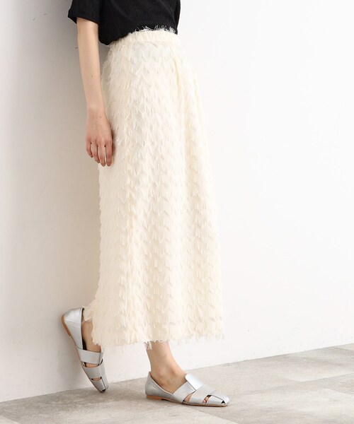 ■ポイント/詳細 波型にフリンジが入った素材感があるスカートです。 シルエットは、裾にかけて少しだけフレア感があります。 後ろ中心にスリットが入っています。 ウエストは、ぐるっとゴムになっている為、楽に穿いて頂けます。 ※ポケットなし ■素材/機能性 ポリエステル100%です。 ドライクリーニングがおすすめです。 ※裏地あり ※アイボリー(004)はやや透け感があるため、インナーの着用をおすすめします。 ■おすすめコーディネート カジュアルなアイテム、と甘辛MIXコーデがおすすめです。 スウェットやシャツによく合います。 ※照明の関係により、実際よりも色味が違って見える場合があります。また、パソコン・スマートフォンなどの環境により、若干製品と画像のカラーが異なる場合もございます。 モデル情報:身長166cm B72 W62 H86 着用サイズ:12(M) 店舗へのお問い合わせ商品番号:040-78005 ●製品寸法: 12(M):W66~70cm H102cm 総丈84cm 13(L):W68~72cm H104cm 総丈86cm 備考: