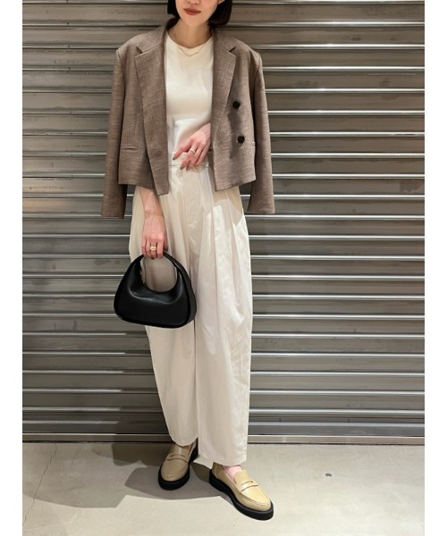 【美シルエットのダンディパンツをトレンド感のある素材で仕上げた今っぽい一着】 【Design/Styling】 今季トレンドのナイロン風の素材で仕上げた、きれいめなダンディパンツ。ウエストは後ろゴムで履き心地もよく、ベルトループはイージーすぎない見え感に。程よい適度なツヤ感と落ち感で、カジュアルさを回避、大人が着やすいように仕上げました。カラーリングで女性らしさも意識しました。タイトめなトップス、特にアシメネックオーガニックリブニットトップス(品番09WNT241087)と合わせるとバランスよく決まるのでおすすめです。 【Fabric】 ナイロンは入っていないので、さらっとしていて、シャカシャカ感はあまりない質感です。程よい適度なツヤ感が上品さを引き立てます。アイボリー、ピンク、チャコールグレーの3色展開です。 ※照明の関係により、実際よりも色味が違って見える場合があります。 またパソコン・スマートフォンなどの環境により、若干製品と画像のカラーが異なる場合もございます。予めご了承ください。 商品の色味は、商品単品画像をご参照下さい。 ※商品画像はサンプルのため、色味やサイズ等の仕様に変更がある場合がございますので、予めご了承ください。