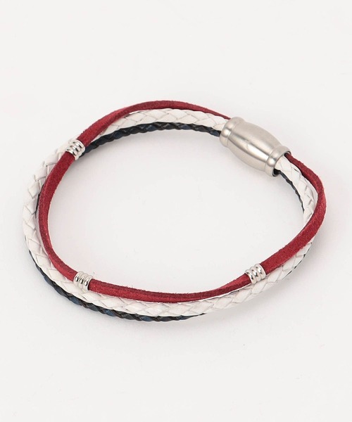 ■デザイン 手首周りのアクセントにピッタリなブレスレットです。 4種類からお好みのデザインをお選びいただけます。 49ブラック コードとテープ部分を全てブラックにまとめた、武骨な印象の3連デザイン。 67ネイビー/91その他2(トリコロール) メッシュコードとスウェードテープを配色で組み合わせた3連デザイン。 コーディネートの差し色にもオススメです。 92その他3 モードな雰囲気漂うビーズブレスレット。 ビーズ間に配したシルバーパーツが高級感を演出します。 ■サイズ 手首周り21cm。 #92はアジャスターによりサイズ調整が可能です。 ■素材 49ブラック:牛革 67ネイビー/91その他2:牛革/合成皮革 92その他3:合成石 ■注意点 摩擦や水分の付着により色移りすることがあります。特に淡色と合わせての着用時にはご注意ください。 ※画像の商品はサンプルです。実際の商品とは仕様・加工・サイズ・素材が若干異なる場合がございます。