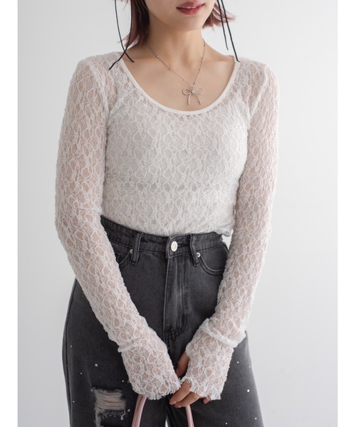 -フラワーレースソー-伸縮性のあるレース素材を贅沢に全体に使用したレーストップス。セカンドスキン感覚で着られる薄さとすっきりシルエットで使い勝手◎前後2wayで着られるので、首ぐりのシルエットをお好みで変えてお楽しみいただけます。キャミワンピやサロペットだけでなくカットソーやブラウスの下にレイヤードするのもおすすめです。※袖口・裾は切りっぱなしのデザインです。多少のダメージ感が発生する場合がございます。予めご了承ください。・・・・・・・・・・・・・・・・・・・・・・・・・・・・・・・・・・・・・・・・・・・・・・・◆アイテム詳細素材…ナイロン95% ポリウレタン5%透け感…あり生地の厚さ…薄め 伸縮性…あり裏地…なし・・・・・・・・・・・・・・・・・・・・・・・・・・・・・・・・・・・・・・・・・・・・・・・◆サイズ感身体のラインにすっきりフィットするシルエット。全体的に伸縮性のある素材で、ストレスフリーな着心地です。長めのお袖にはサムホールが付いており、手のひらに半分かかるくらいの袖丈で着ることが可能です。◆スタイリング首ぐりの深さの異なる前後2wayのデザイン。キャミワンピやサロペットにレイヤードする着こなしはもちろん、スウェットやジャケットから長めのお袖をちらっと見せれば一気に垢ぬけた印象のコーデに。[ select item ]JUMELLEらしい、ガーリーカジュアルなスタイルにぴったりなアイテムを厳選してセレクト。着心地やシルエットまでcheckし、セレクトしています。-キーワード-レース シアー インナー トップス 透け感 重ね着 レイヤード 花柄 Uネック サムホール ガーリー バレエコア 韓国ファッション 着回し 発表会 女子会 記念日 ディナー ランチ デート 低身長 高身長 体形カバー 細見え 着痩せ