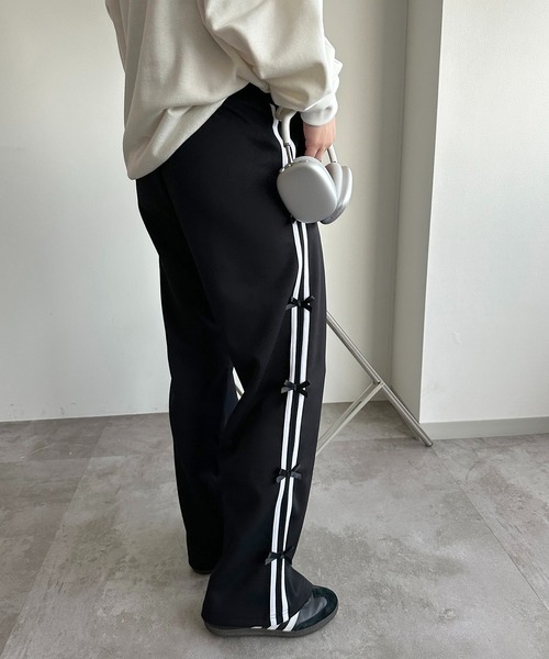 【トレンド感抜群!リボン付きのラインパンツ】ライン×リボンがポイントのトレンド感抜群なトラックパンツ。ジャージのような素材になっていて柔らかく伸縮性のあるリラックス感のある1枚です。ウエストもゴムになっているので着心地◎シルエットの綺麗なストレートシルエットなのでラフになりすぎず大人な印象で着用していただけます。長めの丈やオーバーシルエットのトップスとの合わせがおすすめ。きれいめなシャツとバランス良く着用したりTシャツ、スウェットでストリートな印象にもおすすめです。---------------------------------------生地の厚さ:普通透け感:なし裏地:なし伸縮性:ありポケット:ありファスナー:なし---------------------------------------※サイトに表示されておりますカラー表記とお届け商品についておりますタグのカラー名が異なる場合がございますが、実際の商品のカラーは画像と相違ございません。※ご覧のモニター環境や撮影環境により実際の商品と多少色味が異なって見える場合がございます。ご理解の程よろしくお願いいたします。【お買い物をよりお楽しみいただく為に♪】▼商品のお気に入り登録をおすすめします♡をクリック!完売カラーの再入荷や、ラスト1点の通知、セールの際の通知を受ける事ができます。ブランドのお気に入り登録もご一緒にお願い致します。