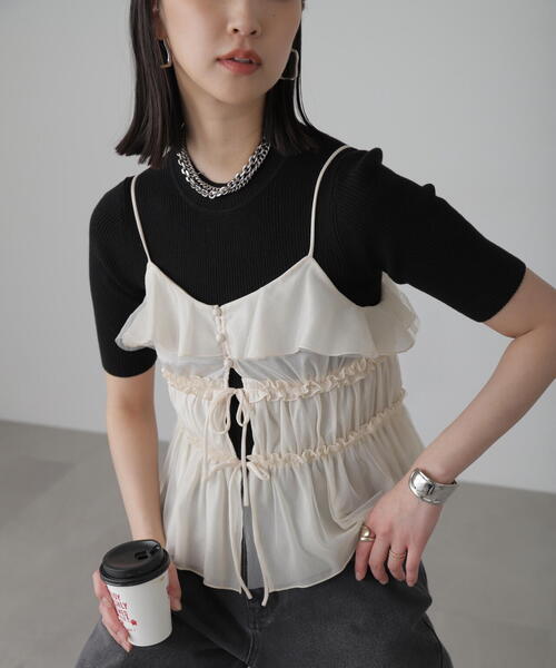 (fabric&design) チュールとシャイニーなシアー感のある楊柳素材を重ねて仕立てたキャミブラウスです。 二枚仕立ての襟元とペプラムフリルでふんわりとしたボリューム感を作り、ウエストラインはシャーリングでフィットさせメリハリ感のあるシルエットに。 フロントは衿元のクルミボタンと華奢なリボン仕立てでポイントをプラスしました。 ボタンだけを閉じ、リボンんは垂らしてフロントスリットな着こなしも甘くなりすぎずお勧めです。 肩ストラップはアジャスターで調節可能です。 (styling) カップ付きタンクやTシャツのレイアードしたビスチェ使いも可愛いです。 エッグデニムやパラシュートPNなどボリューム感のあるボトム、ナローSKなど甘辛MIXなコーディネートがおすすめです。 ■透け感:ややあり ■生地の厚さ:薄手 ■裏地:なし ■伸縮性:なし ■光沢:あり ■シルエット:スタンダード model:骨格ウェーブ --------------------------------------------------- ◆商品のお気に入り登録◆ お気に入りアイテムの値下げ・再入荷・在庫1点などの通知を受け取ることができます。 ◆ブランドのお気に入り登録◆ 新商品や再入荷、セール、クーポン配布などお得な情報を受け取ることができます。 --------------------------------------------------- ※ご注文いただいた予約商品のお届け時期の確認は、注文履歴ページより行えます。