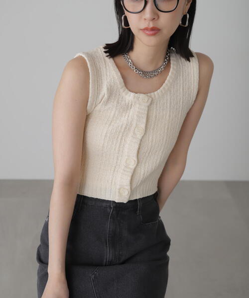 [Fabric&Design]ブークレ糸とストレート糸を組み合わせ、一見ツイードのように編み上げたニットベスト。コンパクトなサイジングでタンクトップのように着用できます。少し大きめに開いたデコルテに大き目の前ボタンがモードな雰囲気。しっかりとしたジャガード編みなのでタンクとして着用でしても透けが気になりません。[Styling]1枚でクロップドトップスとしても、インナーに重ね着しても、すっきりと着用できます。■透け感:なし■生地の厚さ:普通■裏地:なし■伸縮性:あり■光沢:なし■シルエット:スタンダードmodel:骨格ウェーブ---------------------------------------------------◆商品のお気に入り登録◆お気に入りアイテムの値下げ・再入荷・在庫1点などの通知を受け取ることができます。◆ブランドのお気に入り登録◆新商品や再入荷、セール、クーポン配布などお得な情報を受け取ることができます。---------------------------------------------------
