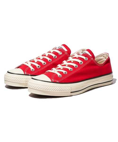 「POP-UP JAPAN」をテーマにした、MADE IN JAPANオールスターのカラーアレンジモデル。 アッパーに日本国旗の日の丸をイメージしたレッドが登場。 テープとシューレースを濃い生成りにすることで、クラシックな印象に。 ヒールラベルの下部に印字した「MADE IN JAPAN」の文字、日本国旗をイメージしてホワイトキャンバスに赤字で印したインソールのコンバースロゴもポイント。 レッドの1カラー展開。