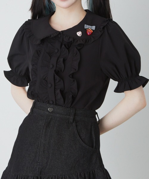ストロベリー×プチリボンモチーフが付いて、ガーリームードが盛り上がるブラウスの登場です♪ 衿にストロベリー×プチリボンモチーフが取り付けられて、可愛らしくスタイリングの好アクセントになります。襟まわり袖口やフロントなど、フリル使いが甘いニュアンスをプラス。 身頃はすっきりとしたシルエットで、クラス感のある印象をGETできる一枚です☆リボン×イチゴモチーフ取り外し可