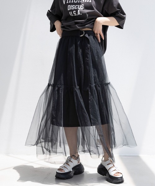 今年のマストキーワード「シアー」「レイヤード」。 大人の透け感を楽しめる、トレンドアイテムが登場! ■ポイント ・2枚のシアースカートがレイヤードされた、フレアスカート ・着こなし次第で、幅広いスタイリングに使用できるマルチウェイアイテム◎ ・たっぷりギャザーのティアードデザインで、程よいボリューム感のあるシルエットに。 ・ウエストはベルト仕様の為、着脱が簡単!どんなボトムスにも巻きやすいデザイン! ・内側のスカートはぐるっとゴム×紐仕様の楽な穿き心地 ・程よい丈感で仕上げたペチコートは、取り外し可能◎ ・季節を問わず、ロングシーズン着こなせるのも嬉しいポイント! ■素材 今年のトレンド、マストで持っておきたいシアーアイテム。 ふわっと広がるシアーチュール素材で、大人可愛い印象に! 軽い生地なので、レイヤードしてもかさばらないのが嬉しいポイント◎ ■スタイリング シンプルなパンツやスカート、ワンピースに合わせるだけで、今年らしいスタイリングが完成◎ デニムやナイロンパンツを仕込み、カジュアルダウンさせたスタイリングが今年らしくておすすめです! ショートパンツなど、ミニボトムに合わせると、さりげない肌見せができます◎