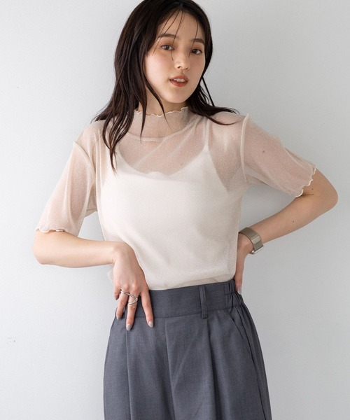一枚着もレイヤードにも使える◎ トレンドのラメがコーディネートのアクセントにぴったり。 ■ポイント ・レイヤードスタイルのインナーとして大活躍間違いなし! ・ラメ、メロー、シアーとディテールの詰まった一着。 ・伸縮性のある素材を使用し、着心地の良さも◎ ・ハイネックに仕上げ、小顔効果抜群! ・程よいラメと透け感が女性らしく、スタイリングのアクセントに! ・半袖なので、春はレイヤード、暑い時期は一枚着でお楽しみください! ■素材 程よい透け感が大人っぽさを演出してくれるシアートップス。 柔らかくストレッチ性のある素材を使用し、着心地抜群です◎ ■スタイリング トレンドのレイヤードコーデにぴったりのシアートップス。 ロングスカートやスラックスを合わせたキレイめスタイリングはもちろん、 デニムパンツを合わせてカジュアルな雰囲気も楽しめます〇