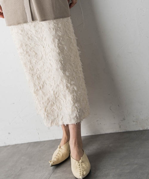 上品さに華を添えるジャガードスカート。華やぐフリンジジャガード素材がコーディネートのアクセントに。スカートシルエットはベーシックなIラインにすることで華あるアイテムも日常に溶け込む。ウエスト後ゴムで履き心地楽。ヒップ~裾にかけてストレートシルエットの為甘すぎず、すっきり見え。着用時にフロントが綺麗に見える様、ウエストベルトはフラットに、ウエストはダーツで美しく。【スタイリング】コンパクトシルエットのボトムスは、ルーズなトップスとの合わせが旬バランス。2107-42060とセットアップ可能。【素材の特徴】フリンジのように起毛した表面がポイントの中肉ジャガード素材。体のフォルムを拾わない程よい肉感。ほんのりハリ感とシワになり難い質感も特徴。【同シリーズ】2107-42073 ツッキリジャカードドッキングプルオーバー----------------------------------洗濯方法家庭洗濯:液温は40℃を限度とし、手洗いが出来る。自然乾燥:日蔭の吊り干しがよい。アイロン:底面温度150℃を限度としてアイロン仕上げができる。ドライクリーニング:石油系溶剤による弱いドライクリーニングができる。----------------------------------■モデル身長 166cm 170cm /着用サイズ M※画像の商品はサンプルとなりますので実際の商品と仕様、加工、サイズが若干異なる場合がございます。※お客様のモニター環境により実際のお色と多少異なる場合がございます。※撮影状況や光の当たり具合により、色合いが異なって見える場合がございます。