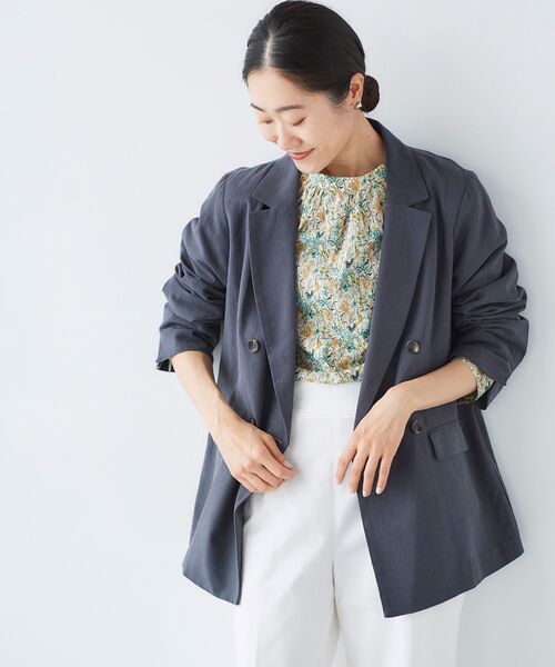 シーズンライクな麻素材で仕立てたダブルブレストジャケット。 リラックス感のあるボックスシルエットとゆとりのある袖で、サラッと羽織れて暑い時期まで着やすい1枚です。 ●ポイント 袖口はスリット仕様で、ラフに袖をまくっても様になるデザイン。 麻素材とマッチするドライな雰囲気のマーブルボタンで、こなれた雰囲気に仕上げました。 ●おすすめコーデ 通勤にもお出かけにもさっと羽織ってスタイリッシュに。 シャツはもちろん女性らしいワンピースの羽織りにもぴったりな一着です。 ==================== 透け感:なし 裏地:なし 伸縮性:ややあり 光沢感:なし 生地の厚さ:やや薄手 ==================== 【スタッフ着用コメント】 <スタッフA> 20代後半/157cm/骨格ウェーブ/普段サイズS‐M/着用サイズ38 サイズ感:程よくゆとりがあり、着丈はお尻が隠れる長さです。肩が若干余る感じました。 素材感:麻混の軽くて通気性の良い素材。 着用感:動きやすく、オンオフどちらにもオススメです。 <スタッフB> 30代前半/167cm/骨格ウェーブ/普段サイズ38‐40/着用サイズ38 サイズ感:オーバー過ぎず、程よくゆとりのあるシルエット。ヒップにかかる丈。 素材感:裏地無しの薄手素材。柔らかく、軽い着心地。 着用感:きちっとしすぎず、オンオフで着回しを楽しめます。