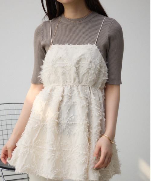 ・ポリエステルジャカード素材を使用。 ・表面感があり存在感のある生地が特徴です。 ・フリンジが表情豊かなジャガード素材を使用したキャミソールです。 ・華奢な肩紐とバックスタイルが女性らしさを演出してくれる一着です。 ・バスト下切替のフレアシルエットが、気になる体型をカバーしてくれ、スタイルアップ効果も抜群。 ・ウエストはゴム仕様になっているので、着心地、着脱もストレスフリーで着用していただけます。 ・Tシャツやニットとのレイヤードだけでなく、ワンピースとの合わせもワンランク上のスタイルに。 ▼商品のお気に入り登録 お気に入りアイテムの値下げ・再入荷・在庫1点などの通知を受け取ることができます。 ▼ブランドのお気に入り登録 新商品や再入荷、セール、クーポン配布などお得な情報を受け取ることができます。