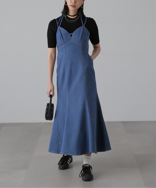 〔fabric&design〕レディライクな胸元にバーアクセントを施し、トレンドライクなポイントをプラス。配色ステッチでカジュアルダウンさせた、マーメイドラインがきれいなデニムキャミワンピースです。ライトオンスのデニムなので、生地が柔らかくシルエットが綺麗なのが魅力です。〔styling〕ホルターリボンは取り外しできるので、合わせるインナー次第でコーディネートをお楽しみいただけます。ふくれジャガードカットソーや、カップ付きインナーシリーズ、コンパクトTシャツなど、カジュアルなアイテムと合わせるのがおススメです。■透け感:なし■生地の厚さ:薄手■裏地:なし■伸縮性:なし■光沢:なし■シルエット:スタンダードmodel:骨格ウェーブ---------------------------------------------------◆商品のお気に入り登録◆お気に入りアイテムの値下げ・再入荷・在庫1点などの通知を受け取ることができます。◆ブランドのお気に入り登録◆新商品や再入荷、セール、クーポン配布などお得な情報を受け取ることができます。---------------------------------------------------※ご注文いただいた予約商品のお届け時期の確認は、注文履歴ページより行えます。